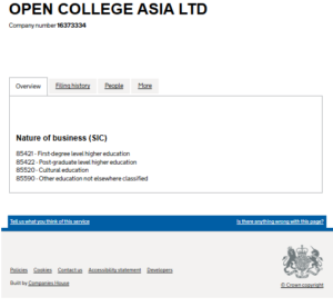 Open College Asia is registered with the UK Government under Ltd number 16373334 and holds the following higher education SIC codes: 85421 (First-degree higher education), 85422 (Postgraduate higher education), and 85590 (Professional and continuing education).
